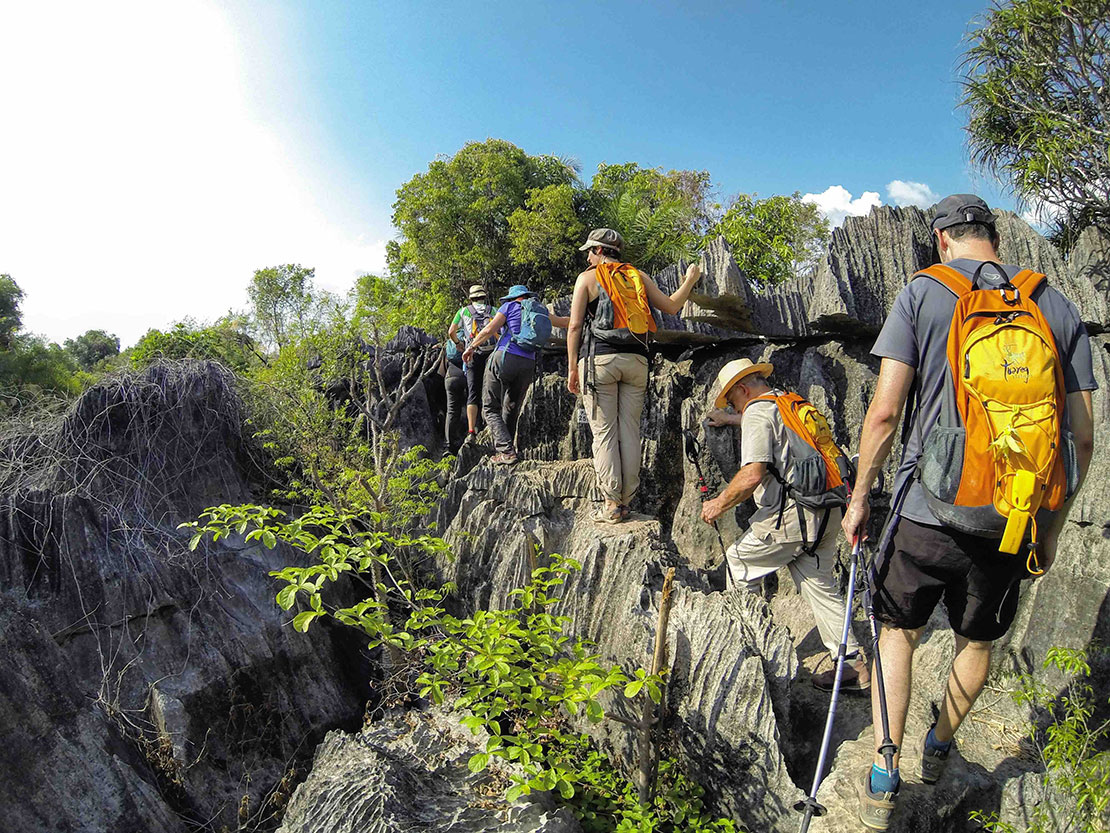 En el oeste de la isla, después de un recorrido por pistas y cruzando varios ríos, alcanzaremos los tsingys. Peculiares formaciones kársticas que visitaremos en caminatas a través de sus 'vías ferratas'.